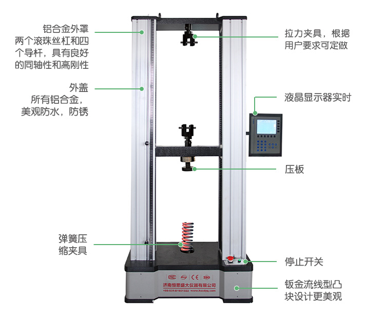 本機(jī)依據(jù)國(guó)家彈簧拉壓試驗(yàn)機(jī)標(biāo)準(zhǔn)規(guī)定的技術(shù)要求制成,專(zhuān)業(yè)設(shè)計(jì)的自動(dòng)控制和數(shù)據(jù)采集系統(tǒng),實(shí)現(xiàn)了數(shù)據(jù)采集和控制過(guò)程的全數(shù)字化調(diào)整。能對(duì)拉簧、壓簧、碟簧、塔簧、板簧、卡簧、片彈簧、復(fù)合彈簧、氣彈簧、模具彈簧、異形彈簧等精密彈簧的拉力、壓力、位移、剛度等強(qiáng)度試驗(yàn)和分析。